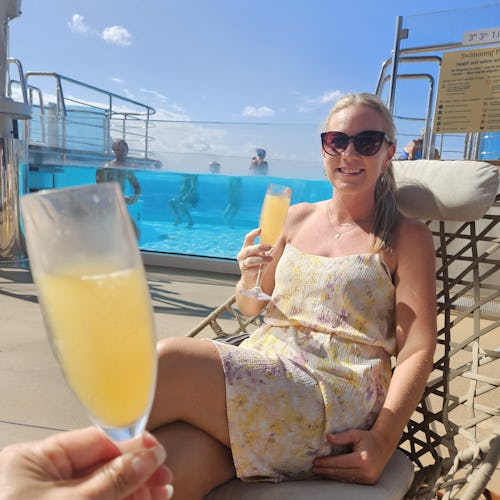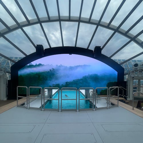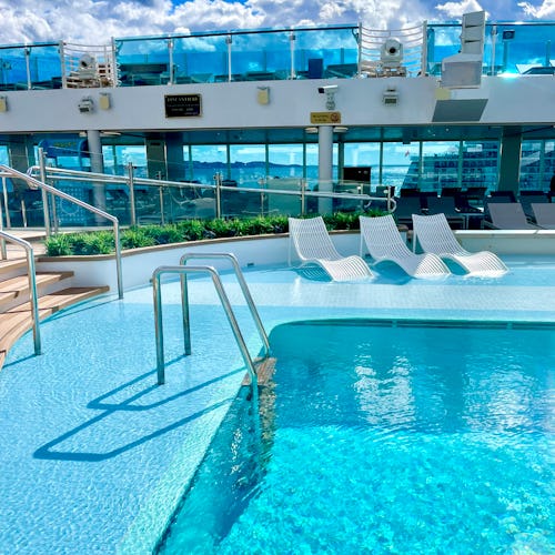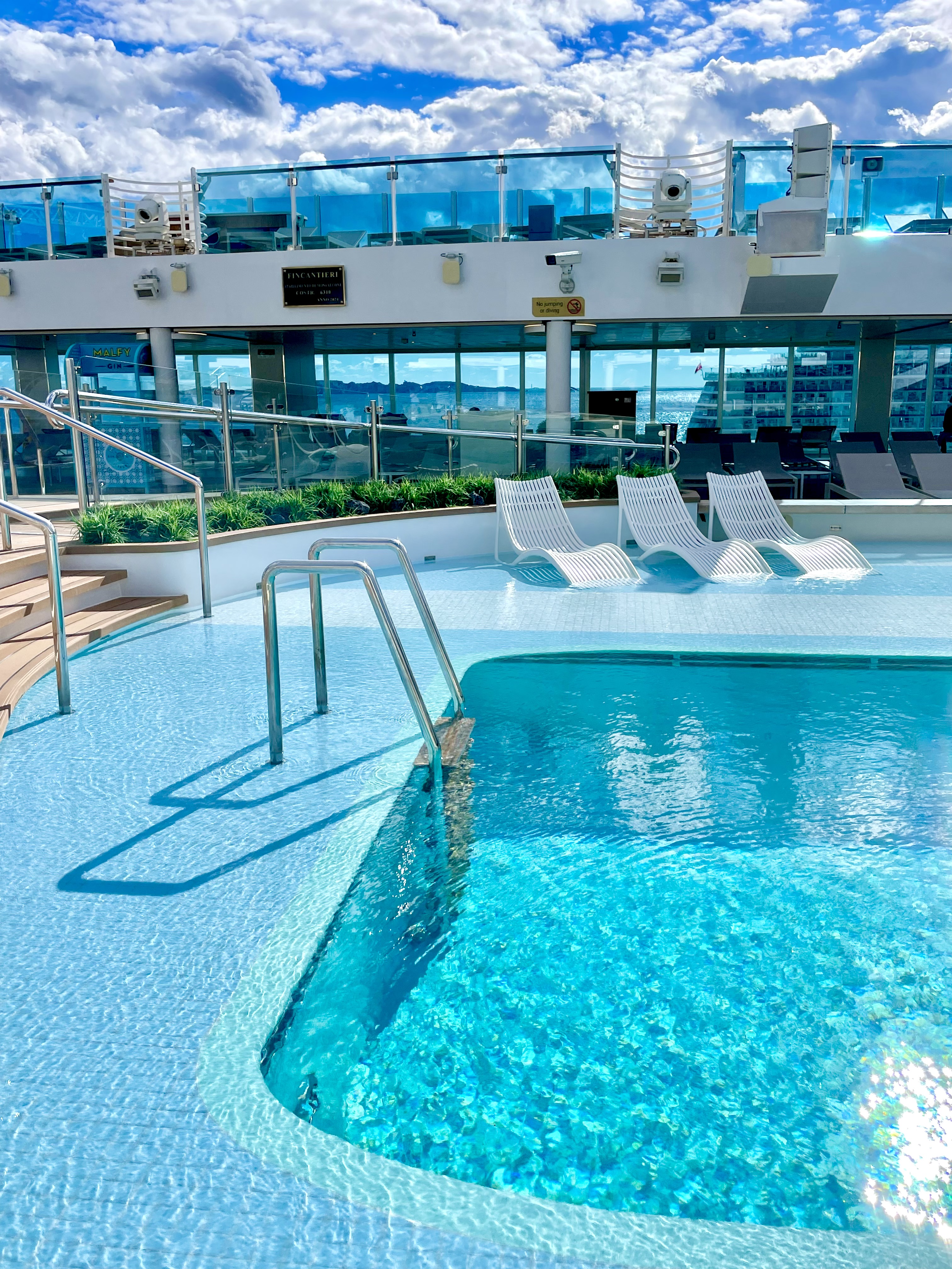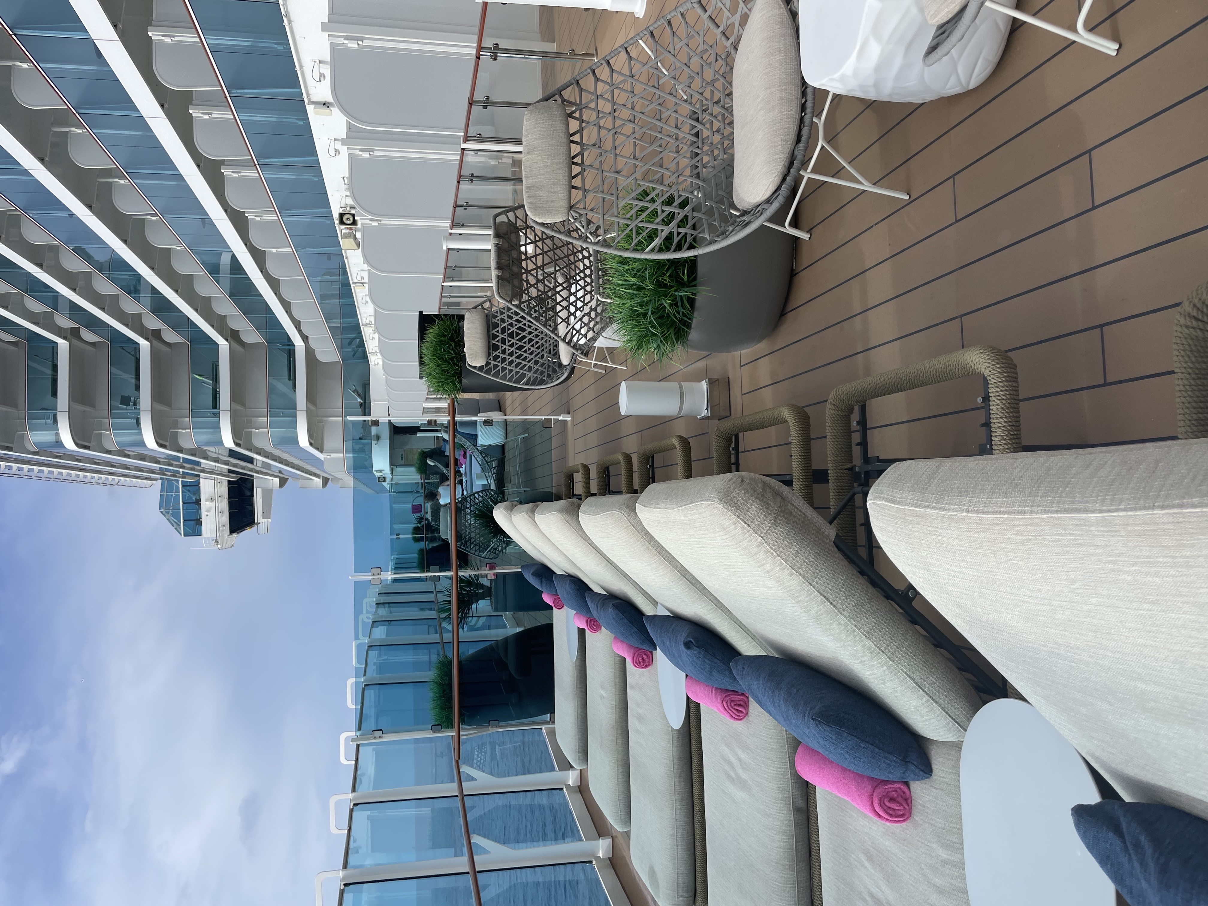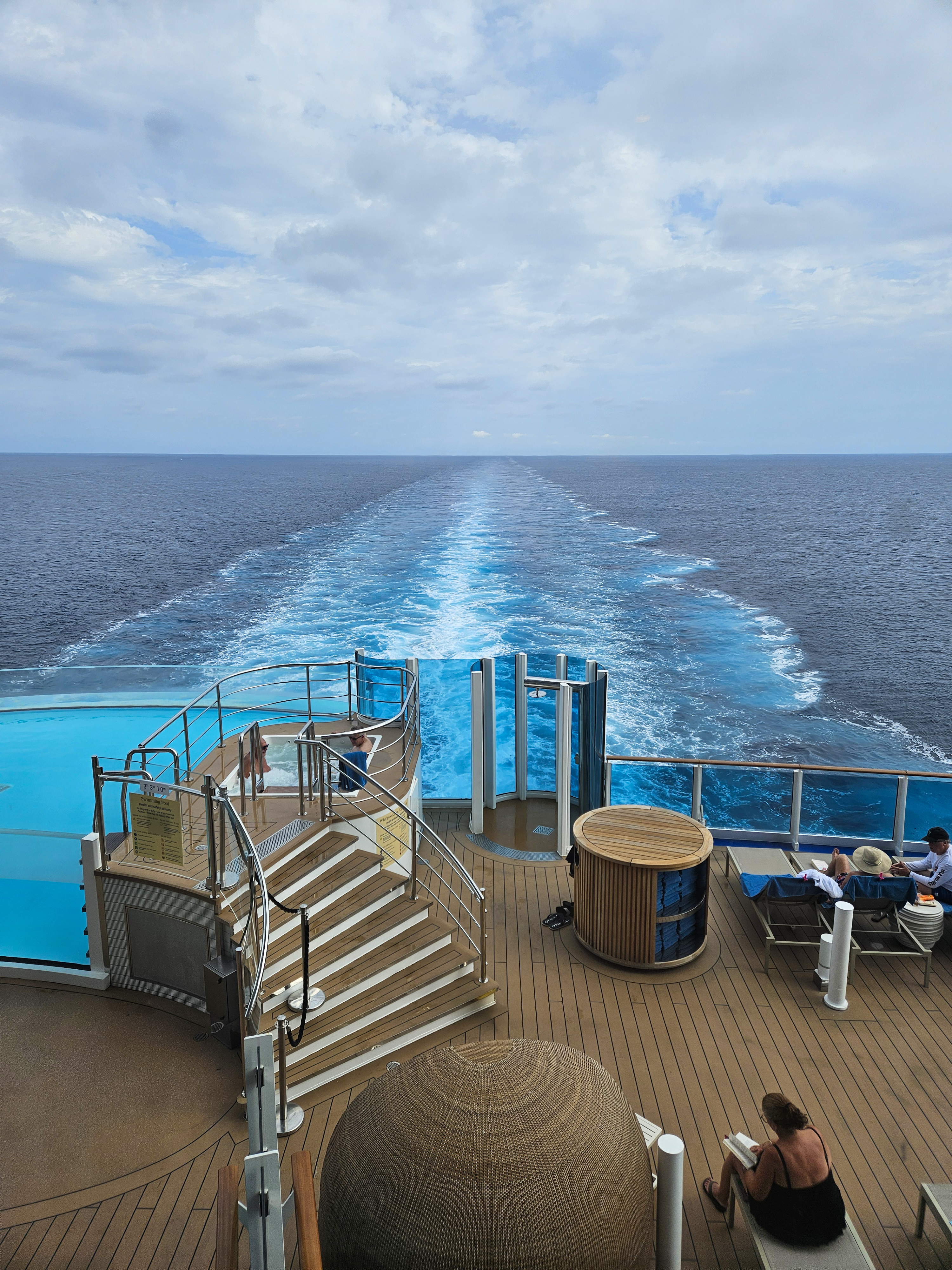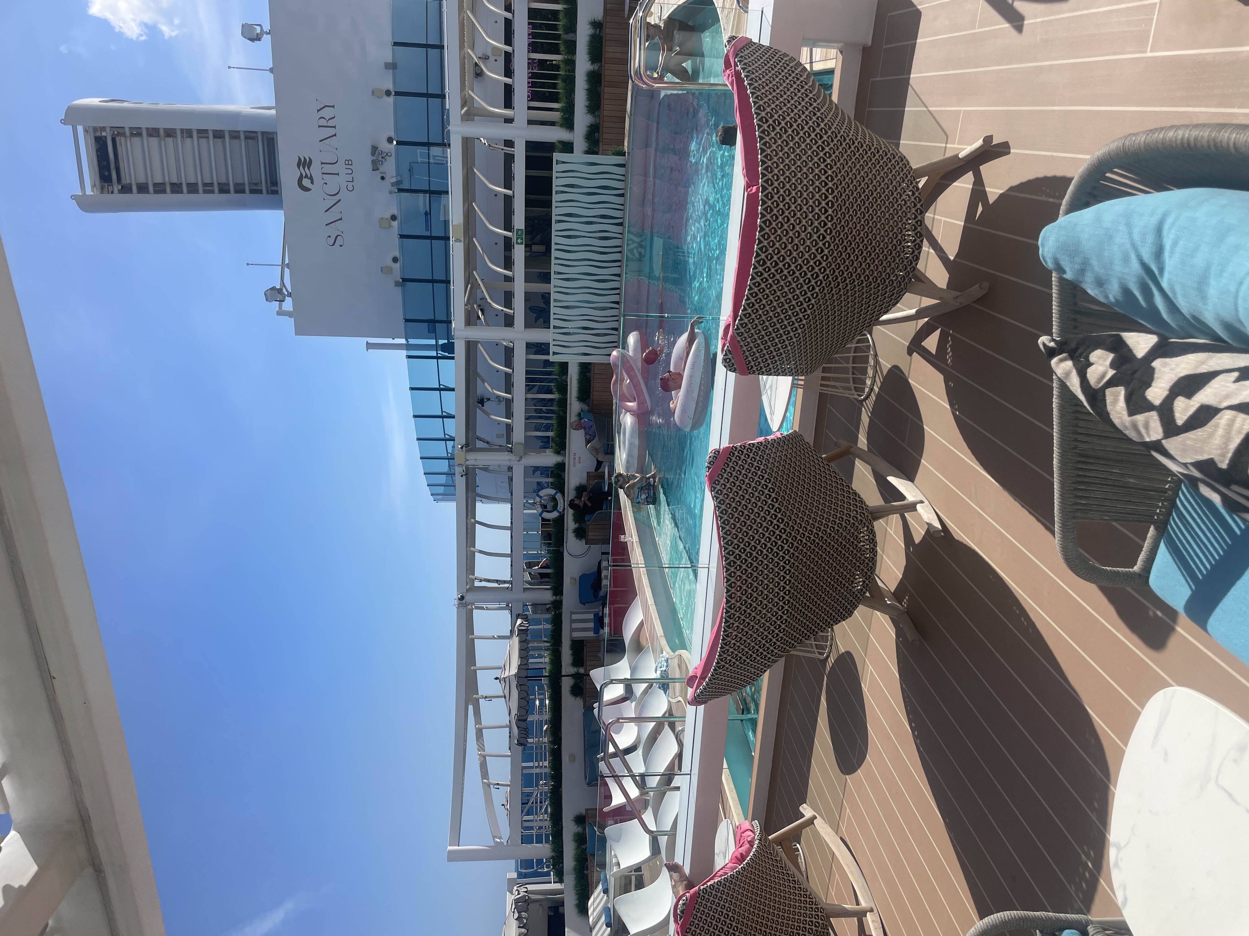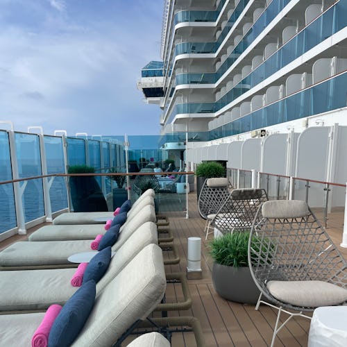 Stemningen hernede var mere rolig end ved hovedpoolen – perfekt, hvis du ønsker at nyde solen og havudsigten i fredelige omgivelser. Kombinationen af design, udsigt og atmosfære gjorde det til et af de mest afslappende steder på hele skibet.