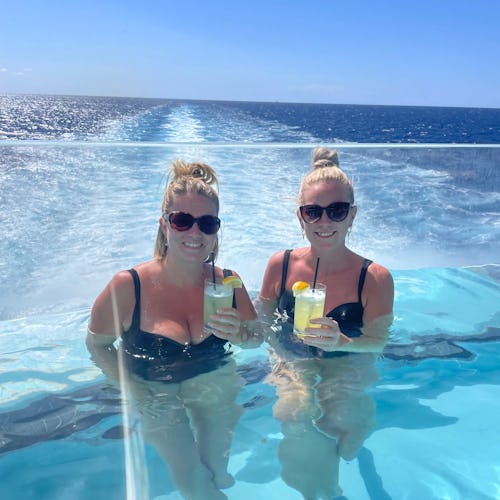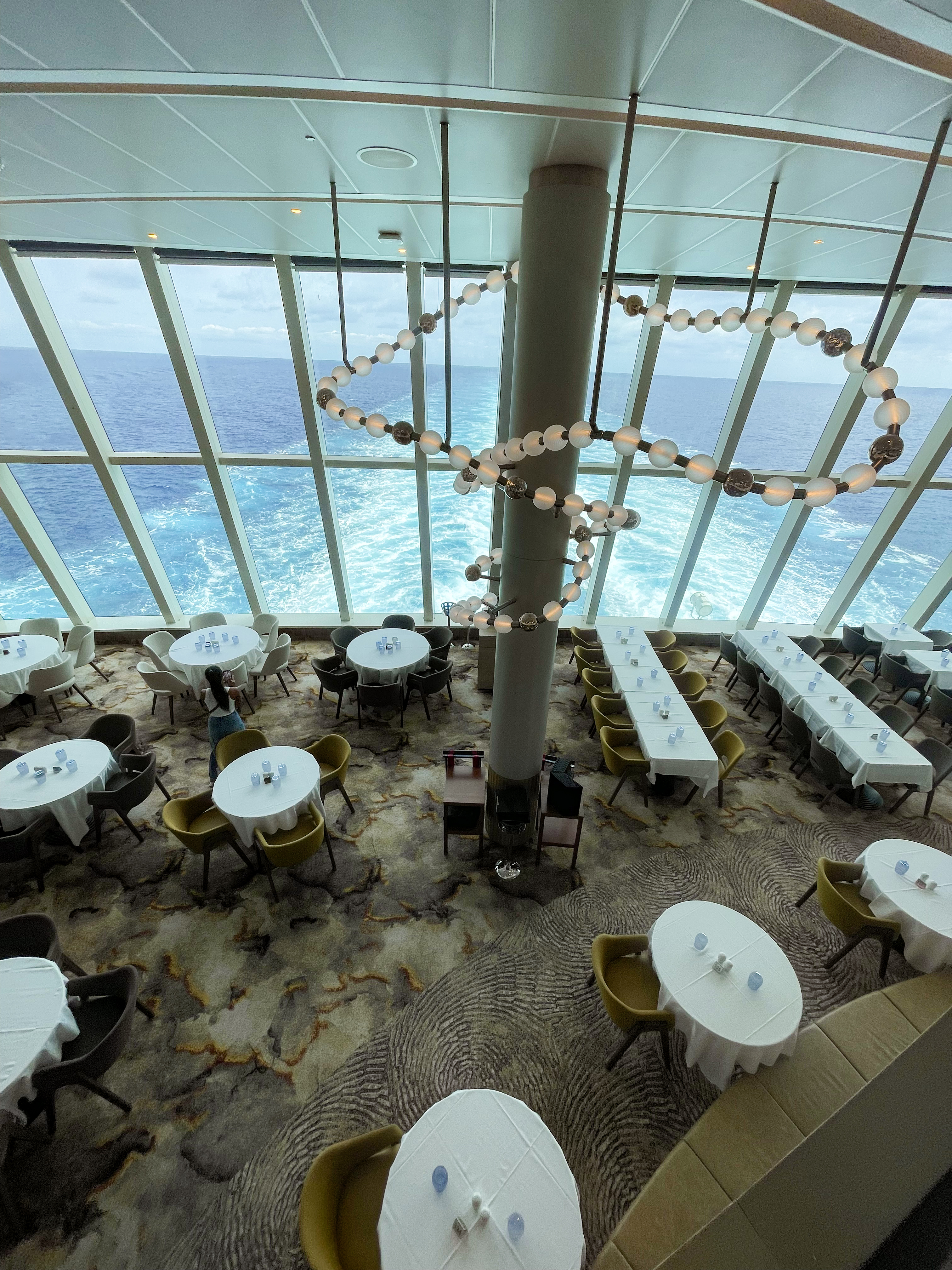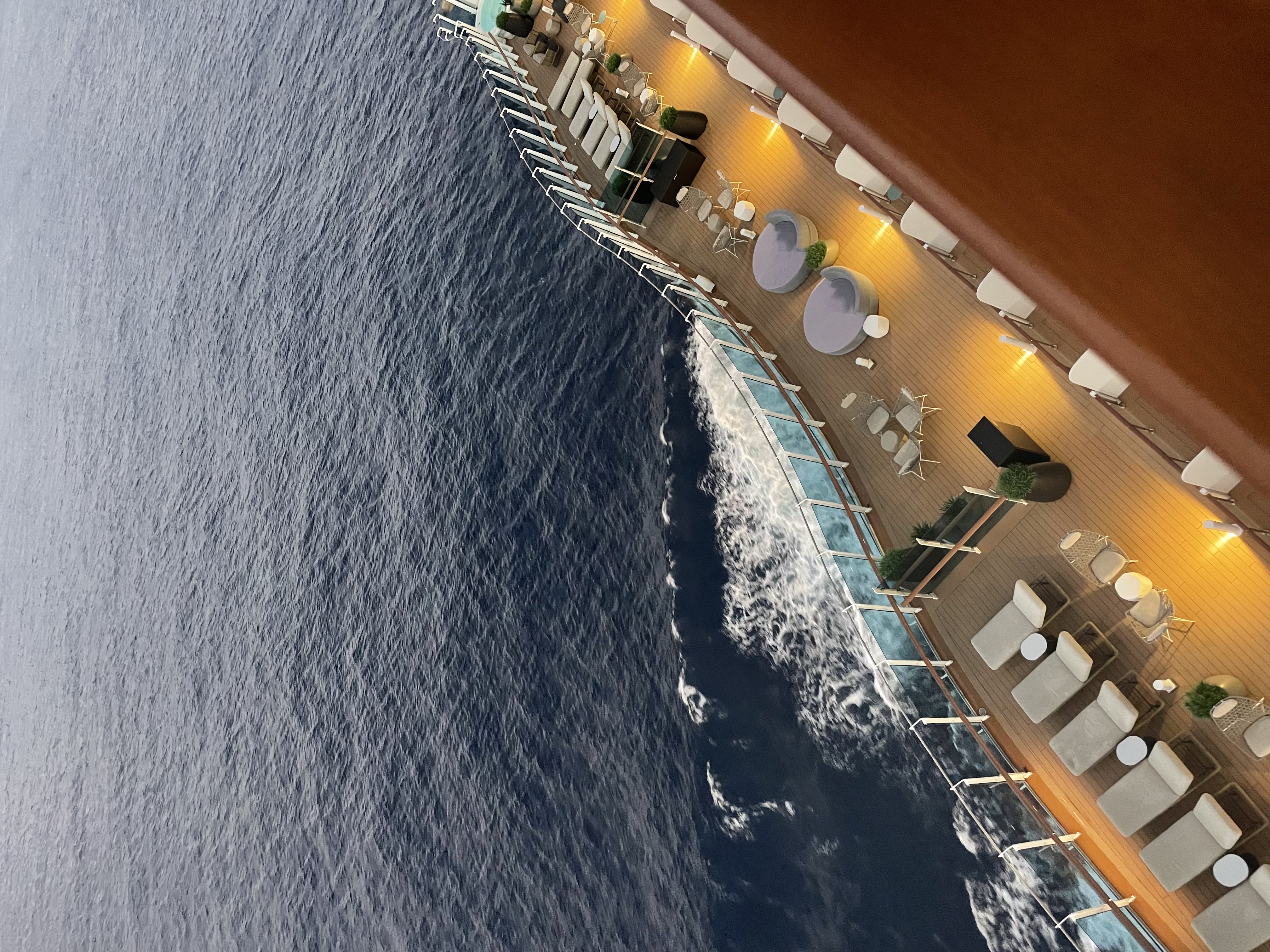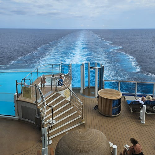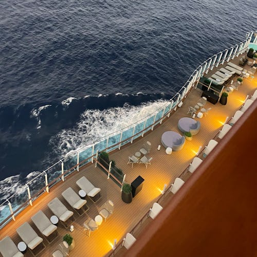Et af vores yndlingssteder ombord var Wake View Terrace, som ligger helt agter på skibet. Her finder man en hyggelig bar og en smuk infinitypool med den mest fantastiske panoramaudsigt over havet.