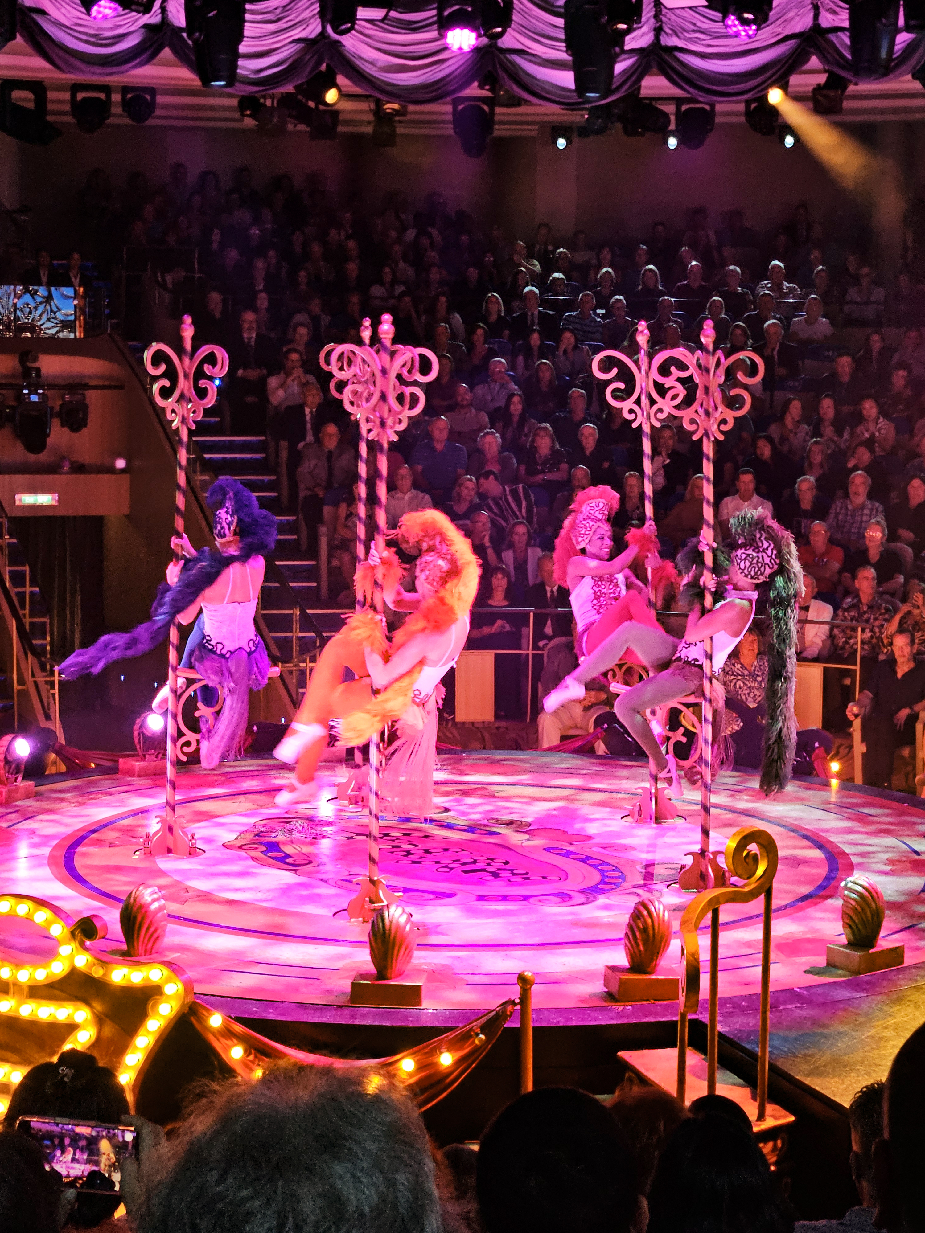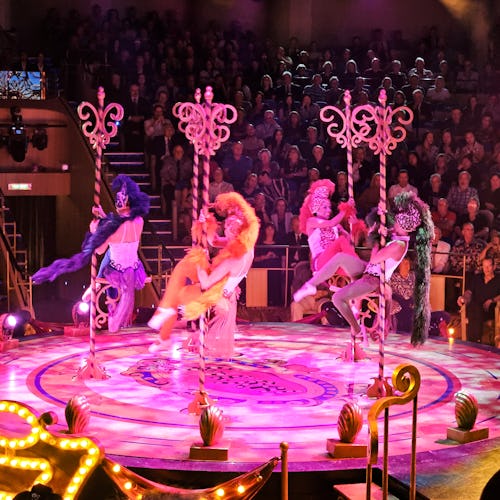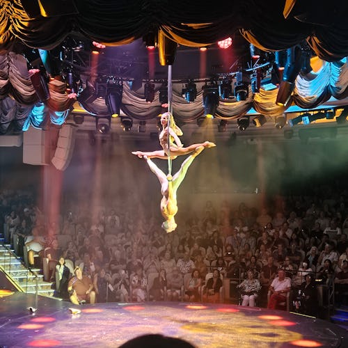 Vi oplevede flere imponerende forestillinger i skibets smukke teater, hvor musik, dans, sang og akrobatik blev kombineret i spektakulære shows, der virkelig imponerede.