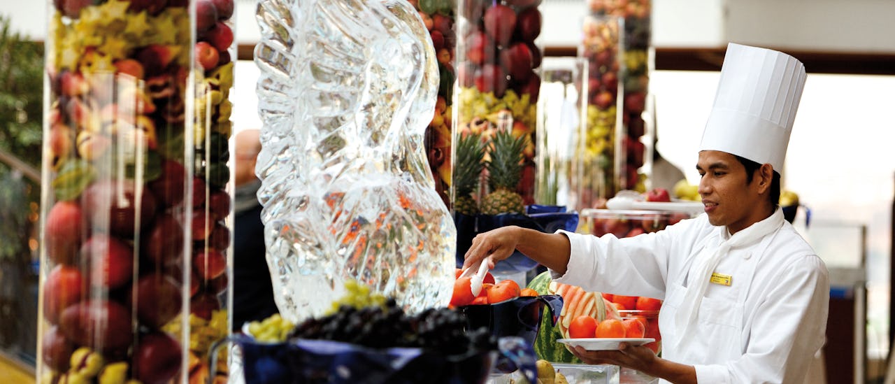 Hovedspisesalen og buffetrestauranten indgår, men højst oppe i atriummet ligger der også en specialrestaurant. Menuen er hovedsageligt italiensk, men indeholder også indslag fra den øvrige verden.