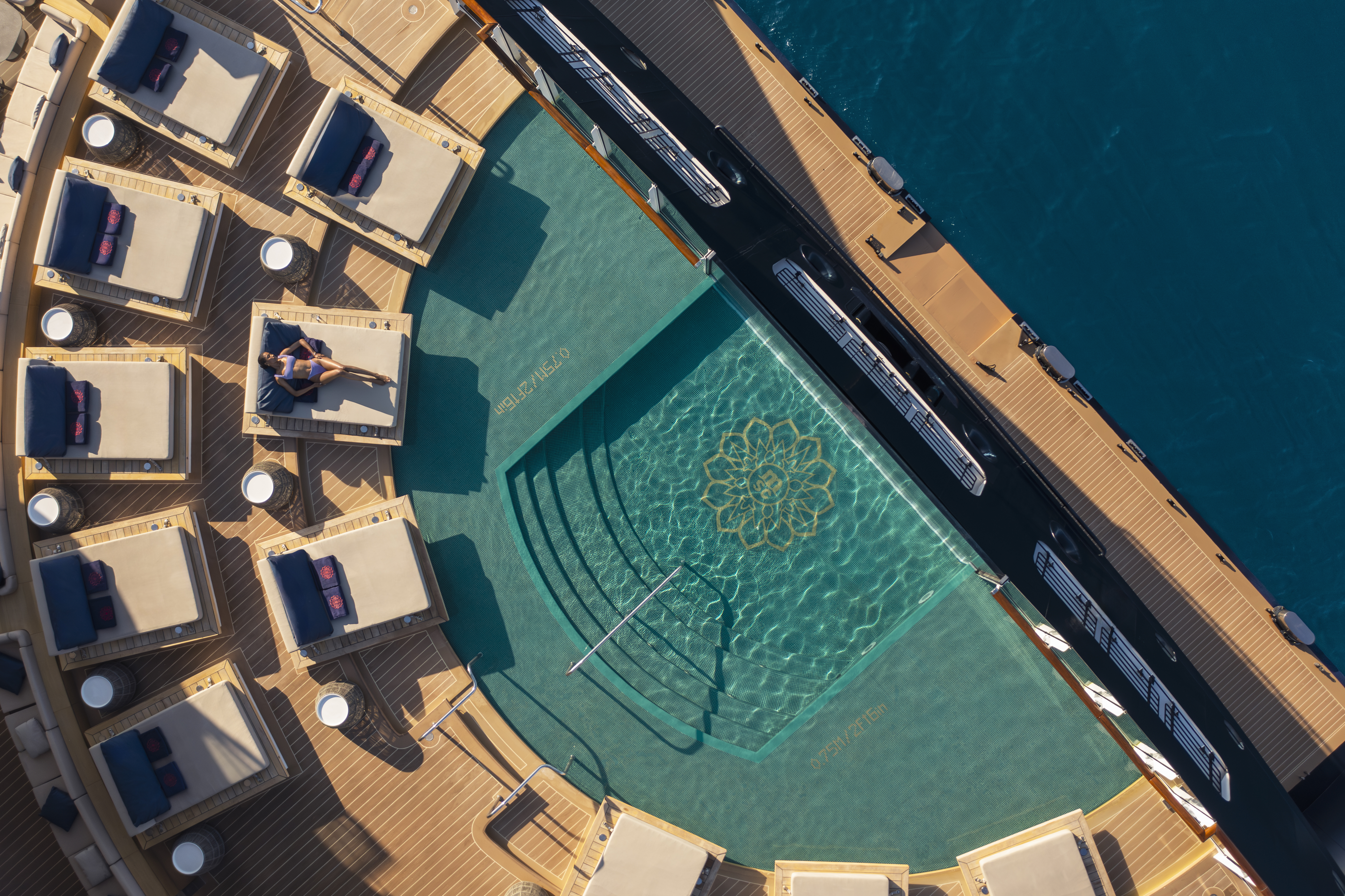 Generøse udendørs dæk der kan prale af mere end 2.500 kvm med en fantastisk udsigt over havet, med 64 private cabanas fordelt ved tre udendørs poolområder.