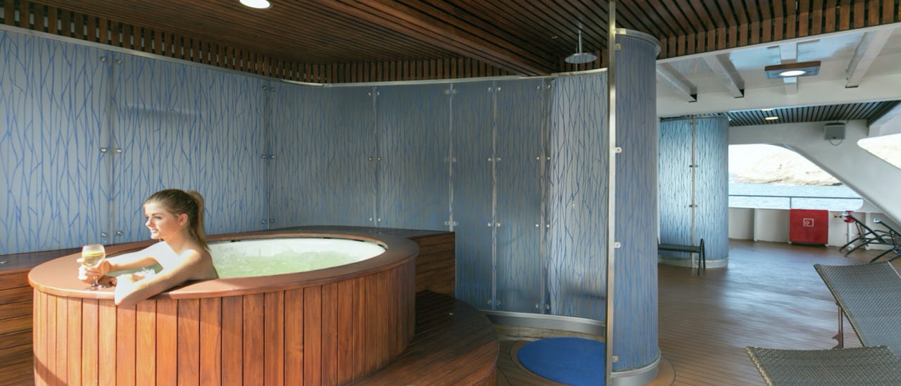 Slap af i komfortable liggestole med enestående udsigt over det fantastiske landskab, eller nyd en af de udendørs jacuzzier. Sky Deck ligger øverst på skibet, her kan du slappe af og nyde solen.