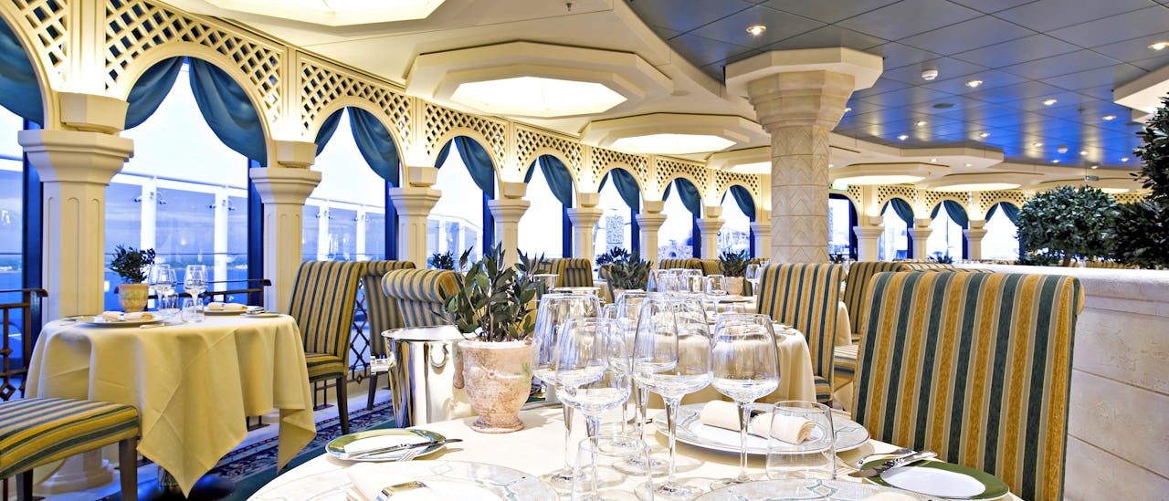 À la carte- og buffetrestauranterne indgår i krydstogtsbilletten. Her kan du nyde en bred vifte af spiseoplevelser fra Middelhavet.