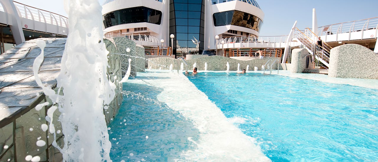 Pooldækket er en destination i sig selv. Du kan sole og bade i fire pools og tolv jacuzzis, eller slappe af i spa-afdelingen med tyrkisk bad.