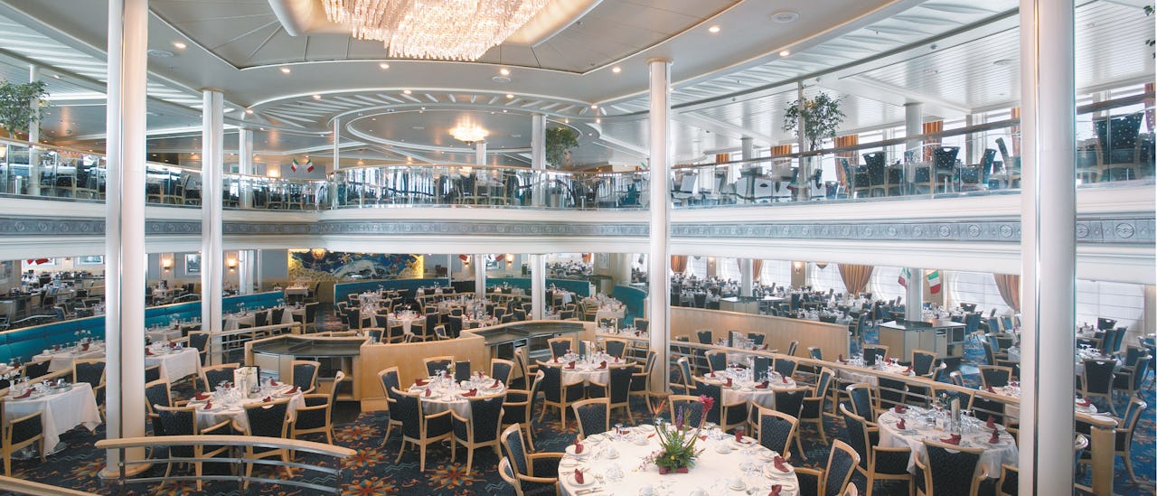 Den to etager høje à la carte-restaurant indgår sammen med buffetrestauranten Windjammer og cafeen i atriummet.