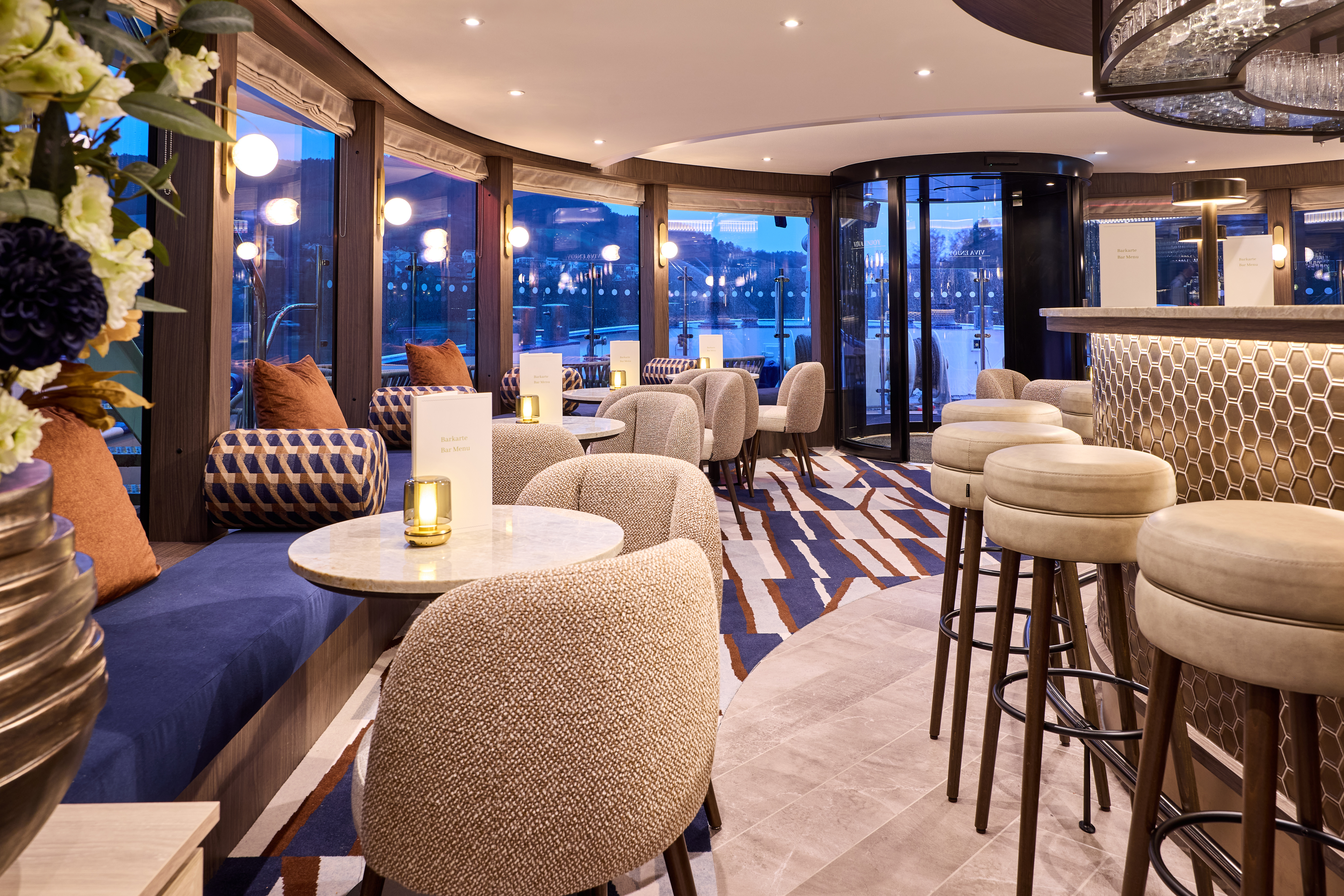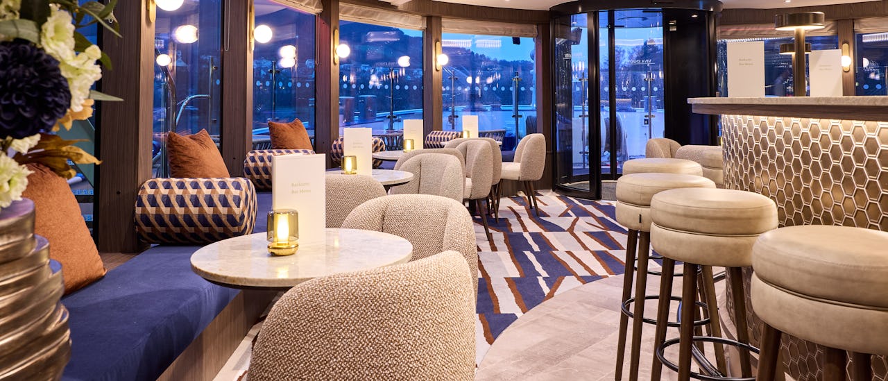 Nyd udsigten over det forbipasserende landskab fra panoramavinduerne i loungen forrest på skibet og slap af i baren med behagelig pianomusik.