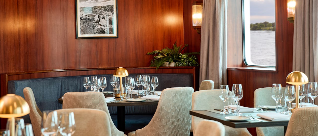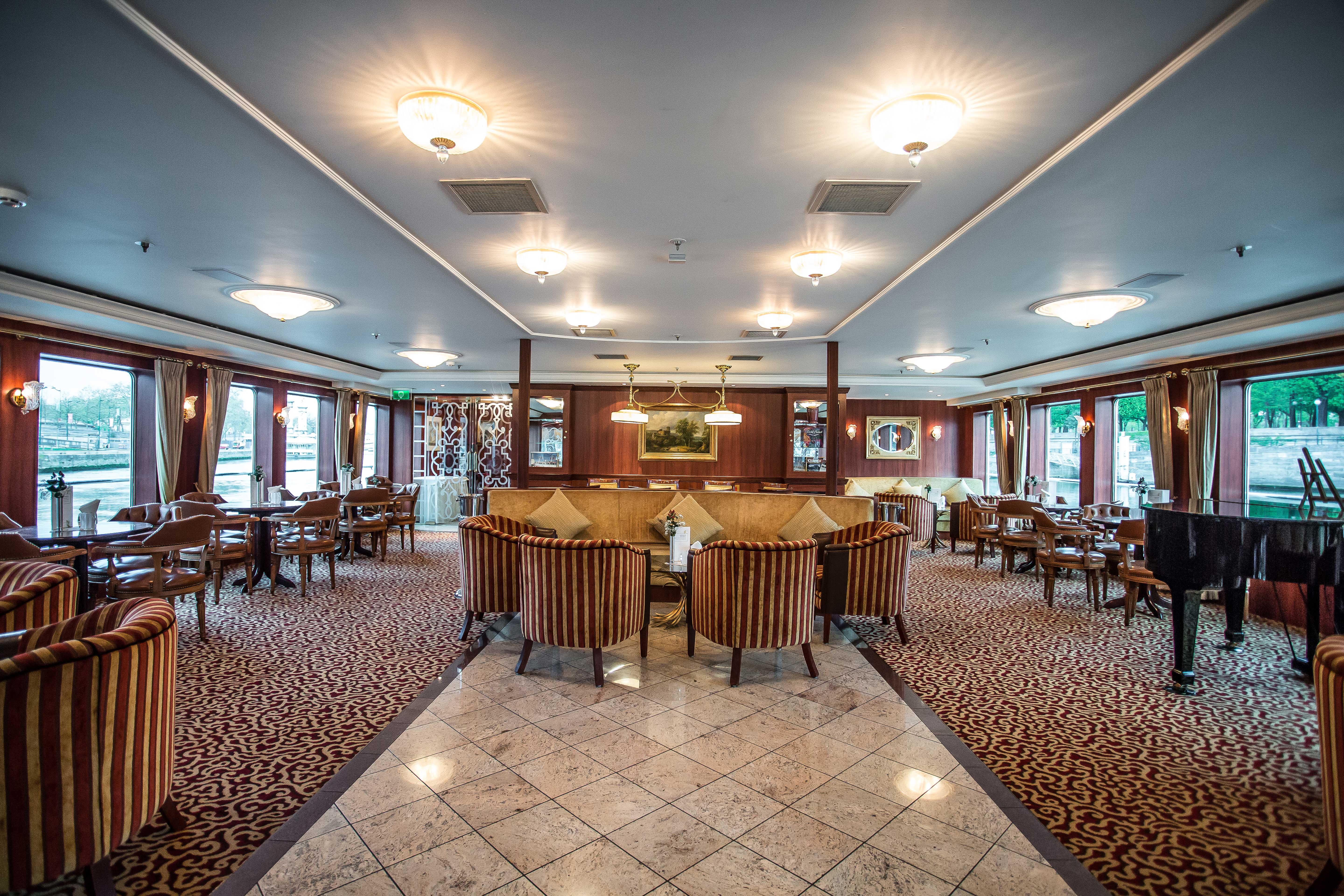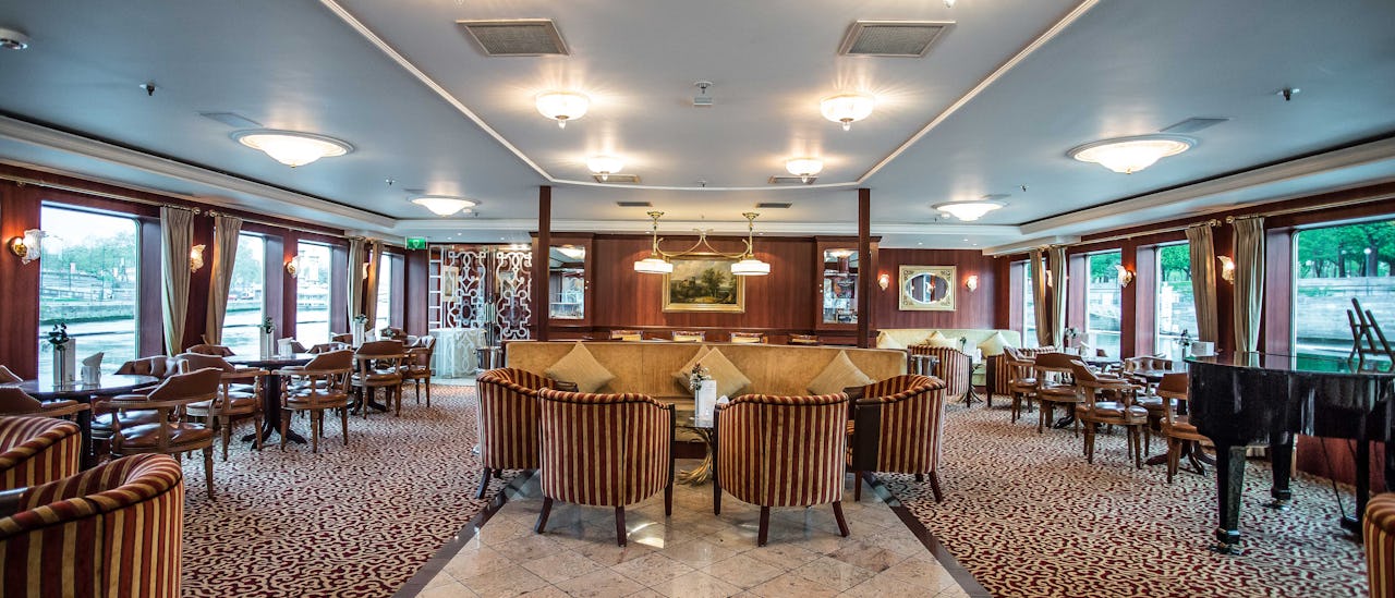Nyd udsigten over det forbipasserende landskab fra panoramavinduerne i loungen forrest på skibet og slap af i baren med behagelig pianomusik.